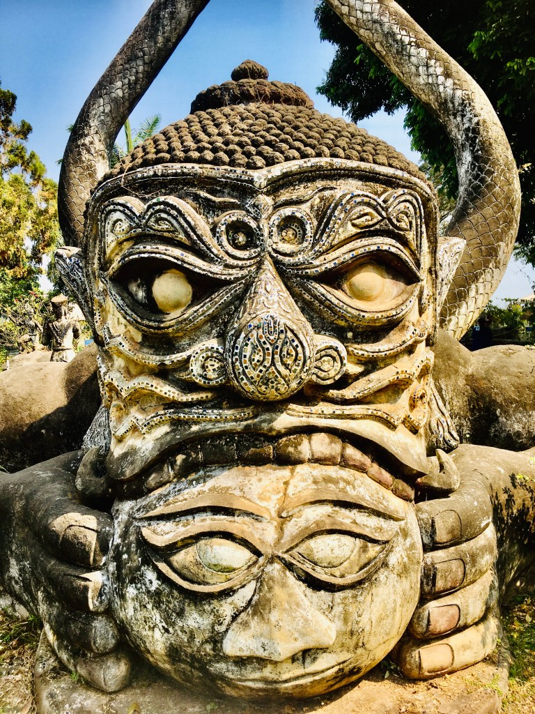 Our first stop on day one of Vientiane was That Dam. Although visually unimpressive, legend has it that the black stupa was home to a seven headed Naga (a serpent from Buddhist mythology) which protected Vientiane’s inhabitants when the town was invaded by the Siamese in 1827. We then visited the Presidential Palace before stopping at the morning market to buy a local SIM card. The next stop was Xieng Buddha Park which contained sculpted Buddhas, ranging from enormous statues to smaller carvings in a peaceful garden. Although a trek from town (45-60 min by bus) we enjoyed exploring. After lunch, we visited the COPE (Cooperative Orthotic and Prosthetic Enterprise) centre, which was founded in 1997. From 1964-1973 the US dropped ~2 million tons of bombs on Laos, the equivalent of a planeload every 8 mins, 24 hours a day for 9 years, making Laos the most heavily bombed country in the world per capita. The COPE centre provides services for people with disabilities (from the war but also non-war accidents). These include prosthetics and psychological and social support, including training them to adapt to life with their injuries. Work also includes land clearance as 10-30 % (~80 million) of the bombs failed to detonate and now explode when farmers hit them, when children discover and play with them or when they are removed for scrap metal (a source of income). Since the war ~70,000 people have been killed or injured by unexploded bombs, of which 40% are children. The museum was OUTSTANDING and contained photographs, example prosthetics, drawings showing the terrors of war (very moving), videos, real life stories and an abundance of information. We then headed to Wat Sok Pa, which hosts mediation sessions on a Saturday. We enjoyed walking in the city as the traffic is less crazy than Vietnam (and less beeping) and the vibe is closer to Thailand. After buying some incredibly expensive smoked cheese (but YAY for cheese) we stumbled across the City Pillar Shrine, before walking alongside the Mekong river, looking out to Thailand (sounds better than it was…). We then stumbled across Laos food festival and got a free cider, before I got to cook for the first time in months!! What a time to be alive…