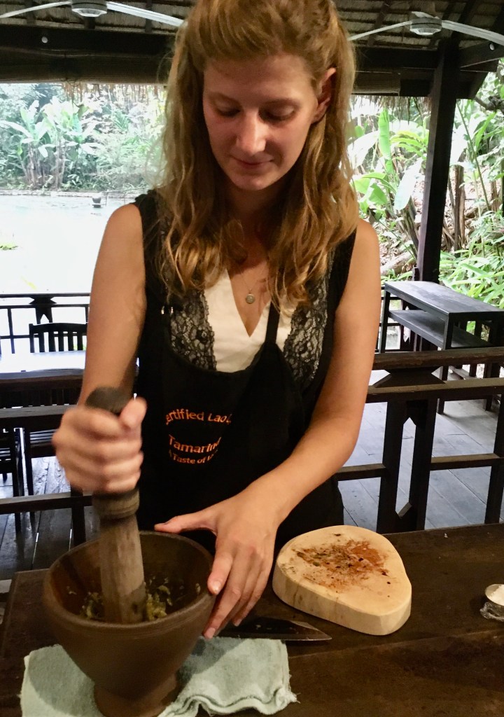 Even for South East Asia, there are A LOT of temples in Luang Prabang. On an early morning walk I first passed the ornate Wat May Souvannapoumaram and then the beautiful national museum. After breakfast we again walked through the town without a real aim, stumbling upon more temples as we went. The Mekong river flows alongside the town and also made for pleasant walking, although some sections were quite littered. After lunch we climbed to the top of Mount Phousi, a popular spot for the sunset. We decided to avoid the crowds and ascend during the day, meaning that we could enjoy the panoramic view (and yet another temple) at the top in relative peace. Then in the evening we took part in a cooking course attached to Tamarind Restaurant. We had wanted to do at least one cooking course during our trip and a few blogs had rated this as one of the best across all of South East Asia. It did not disappoint. We cooked a variety of traditional Lao dishes in a scenic jungle location (website: https://www.tamarindlaos.com/cookingschool).